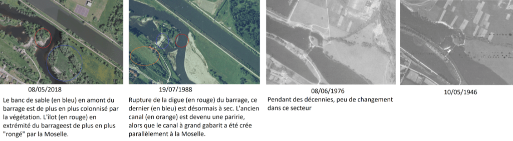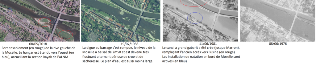 La pratique de l’aviron était alors possible entre le pont routier de Pont-Saint-Vincent et le barrage en aval sur la Moselle, soit un peu plus de 2.000m quasi linéaires.
