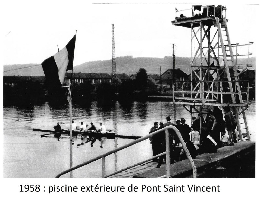 L’histoire de l’aviron à Pont-Saint-Vincent est très étroitement liée à celle de l’ancienne piscine extérieure, les deux activités se déroulant sur le même bassin.